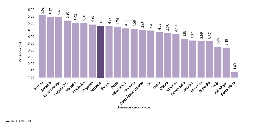 En junio de 2025, el Índice de Precios al Consumidor (IPC) en Colombia se ubicó en 0,10 %, lo que llevó la inflación acumulada en lo corrido del año a 3,74 % y la anual a 4,82 %, según el DANE. En Medellín, la variación mensual fue de apenas 0,01 %, ubicándose entre las más bajas del país, aunque no fue la menor: Tunja (-0,09 %) y Cartagena (-0,07 %) incluso reportaron reducciones en el nivel general de precios. De acuerdo con Andrea Ramírez Pisco, subdirectora general del DANE, los principales aportes a la inflación en Medellín vinieron del alza en los arriendos imputados (0,10 puntos porcentuales) y en el precio del café (0,049 puntos), lo que explica el leve aumento registrado en la capital antioqueña.