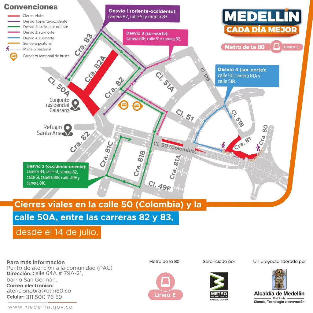 Desde este 14 de julio, se iniciaron nuevas intervenciones en la calle 50 (Colombia), entre las carreras 80 y 81B, y en la calle 50A entre carreras 82 y 83, sentido oriente-occidente. Estas labores, que se ejecutan de manera continua durante las 24 horas, han obligado al cierre parcial y total de algunas vías del sector. Las rutas de buses y vehículos deberán tomar desvíos habilitados por la calle 51 y carreras 82 y 83 para mantener la circulación en la zona.