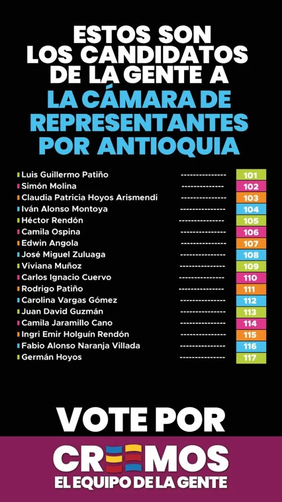 La dirección de Creemos afirmó que su propósito es recuperar la confianza ciudadana mediante “hechos, coherencia y resultados”. Entre los candidatos que integran las listas figuran Juliana Gutiérrez Zuluaga; hermana del alcalde de la ciudad, el expresidente de la Asamblea Andrés Bedoya; el exsecretario de Educación de Medellín Luis Guillermo Patiño; el exsenador Germán Hoyos; y el exsecretario de Gobierno Simón Molina.