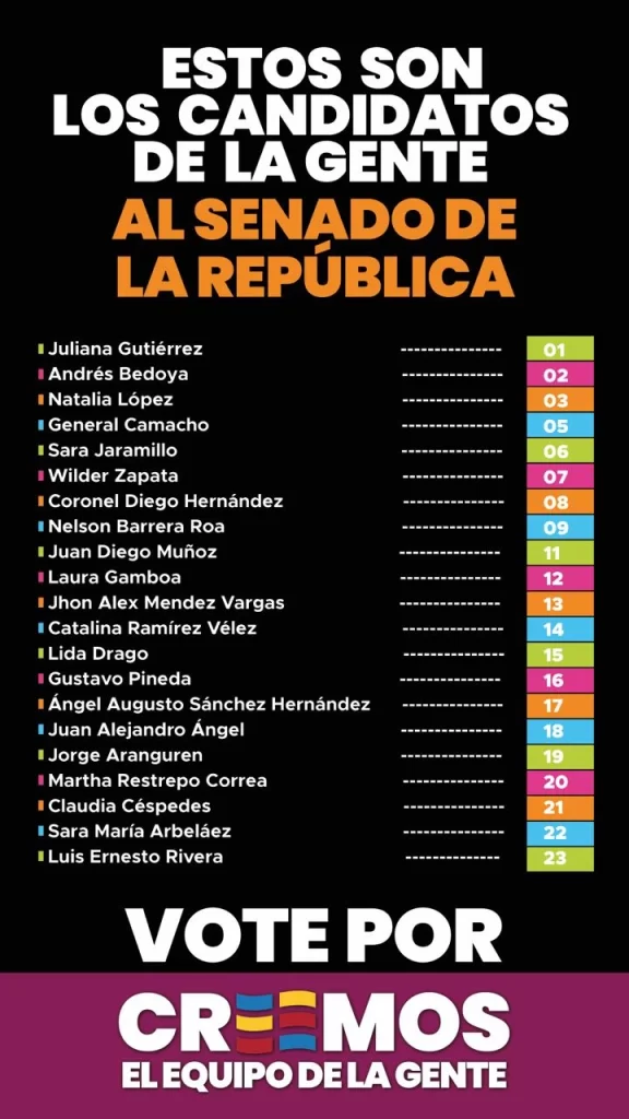 El movimiento señaló que las planchas conjugan perfiles diversos: “ciudadanos comunes y corrientes, profesionales, empresarios, maestros, veterinarios, líderes sociales, jóvenes, mujeres y servidores de diferentes territorios”. Añadió que los firmantes respaldaron principios como la transparencia, la libre empresa y el apoyo a la fuerza pública.