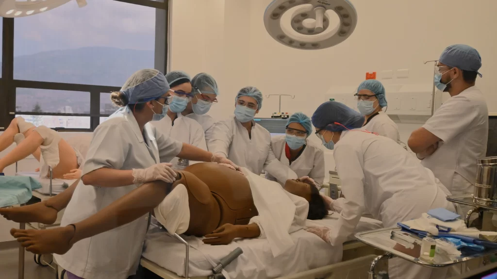 Este centro avanzado de entrenamiento en salud, funciona en el bloque siete de la universidad, en un piso de 600 metros cuadrados, y concentra la inversión en infraestructura, dotación de simuladores, equipos médicos, sistemas de cámaras y sonido. Este espacio recrea escenarios reales como urgencias, quirófano y laparoscopia, lo que permite integrar la teoría con la toma de decisiones clínicas en entornos controlados. Además, incorpora cámaras PTZ (Pan–Tilt–Zoom) y el protocolo NDI, que facilitan la captura de imágenes en alta definición y la evaluación objetiva del desempeño de los estudiantes.