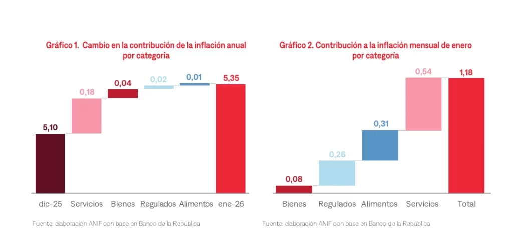 La inflación anual en Colombia, se ubicó en 5,35% en enero, tras acelerarse 25 puntos básicos frente a diciembre (5,10%), mientras que la inflación mensual fue de 1,18%, la más alta para un mes de enero en los últimos dos años, según el DANE. De acuerdo con ANIF, este repunte responde principalmente a los procesos de indexación de precios de inicio de año y al traslado del aumento del salario mínimo, factores que elevan los costos de bienes y servicios clave para los hogares.